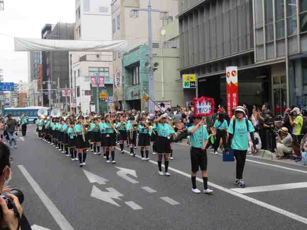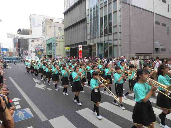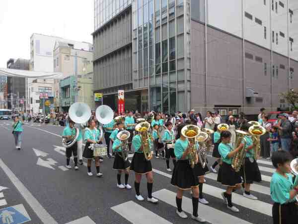 たくさんの観客に見守られる中を、大東小学校金管バンドがパレードしました。