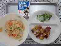 鶏肉のうま味と、とろみのついたあんがご飯によく合います。コロコロ大学芋は、さつまいもとでん粉をつけた白いんげん豆を揚げて、甘いたれで和えました。
