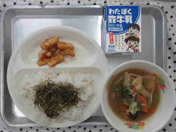 11月8日は「いい歯の日」です。いつも以上にしっかりと噛んでほしいので、噛みごたえのある食材をたくさん使いました。かみかみふりかけには、こんぶやちりめんじゃこが入っています。たくさん噛んでじょうぶな歯をつくりましょう。