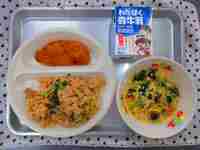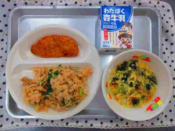今日は、埼玉県東松山市の名物「やきとり」の入ったご飯です。東松山市のやきとりは、豚肉を焼いて、辛いみそだれをつけて食べます。今日は甘辛く味付けをした豚肉をご飯に混ぜました。