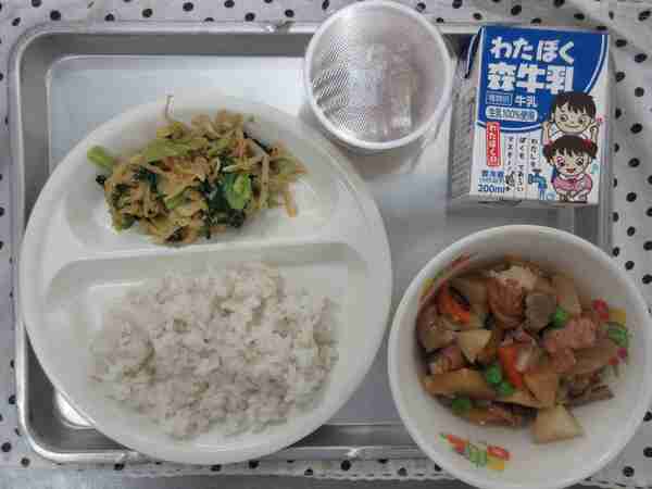 今週は地場産物活用強化ウイークです。地場産物とは、みなさんが住んでいる地域でとれた作物のことです。今日は、埼玉県でとれた大豆を使った納豆や、さいたま市でとれたさといも、こまつななど、たくさんの地場産物を使った献立です。お米はさいたま市西区の農家さんが作った新米です。