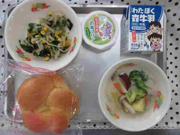 今日は埼玉県の恵みがつまった献立です。埼玉県産の小麦粉とにんじんを使ったキャロットパンと、埼玉県内でつくられた食材が入った彩の国シチュー、埼玉県産のこんにゃくが入ったこんにゃくサラダです。プリンのお茶も埼玉県産です。