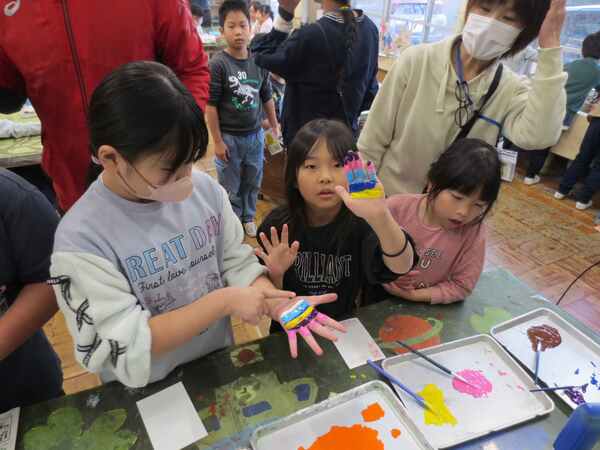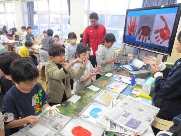 などと、好きな色で年賀はがきの裏面に「手形」をペタ!