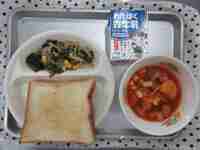 今日は、食パンにマーガリンとメープルシロップをぬって焼いたメープルトーストです。メープルシロップのほのかな甘みと香りが楽しめます。トマト煮は、だいずやひよこ豆とウインナーが入った洋風の煮物です。