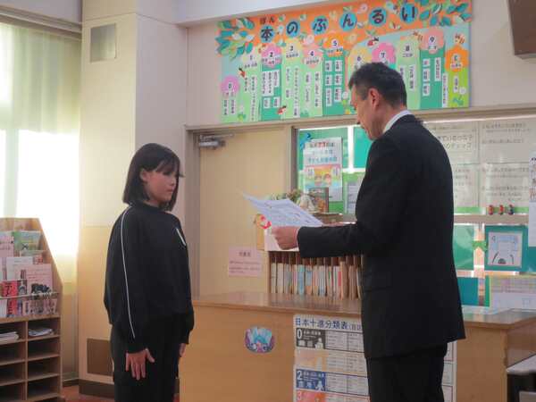 緊張しながらも、よい態度で賞状を受け取る代表の大東っ子たち。