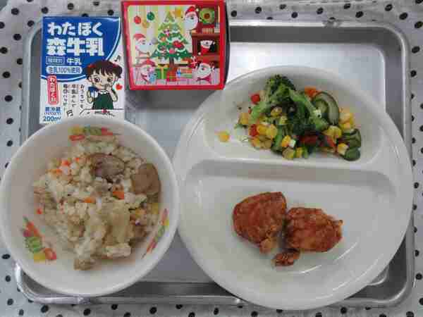 いよいよ2学期の給食も最後になりました。今日はひと足早い「クリスマス献立」です。ラッキーベジタブルが当たった1年2組さんからリクエストをもらった鶏肉のから揚げ、ツリーをイメージしたクリスマスサラダ、セレクトケーキです。