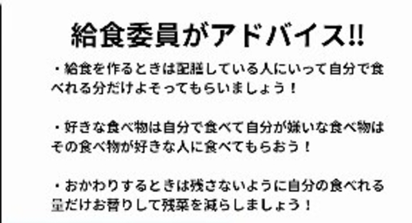 給食委員から提案された解決策を実行して、残菜0を目指しましょう。