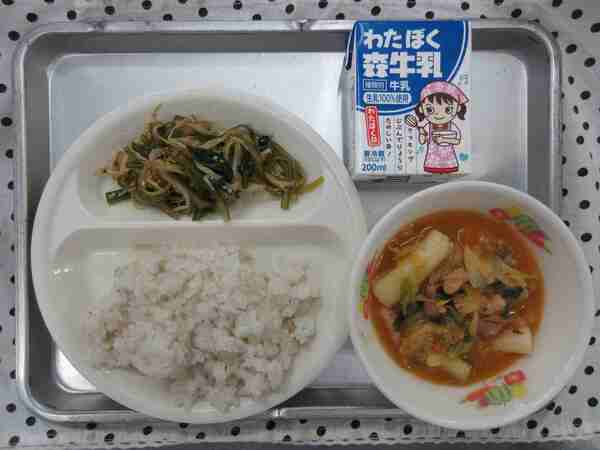 今日は韓国料理の献立です。タッカルビは、鶏肉やキャベツ、たまねぎ、にんじんなどの野菜を甘辛いコチュジャンという調味料で炒めた料理です。また、今日のお米はさいたま市西区の農家さんが育てたものを使いました。