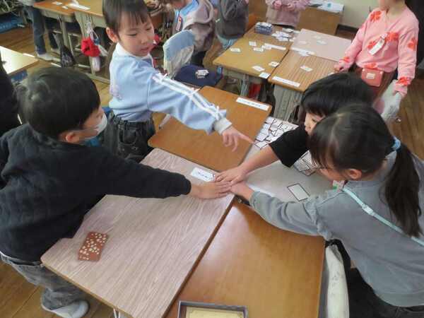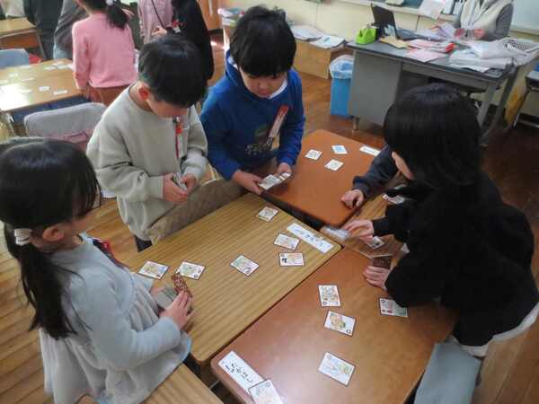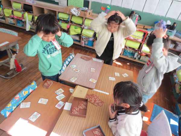 仲よくカルタを楽しむ1年生の大東っ子です。