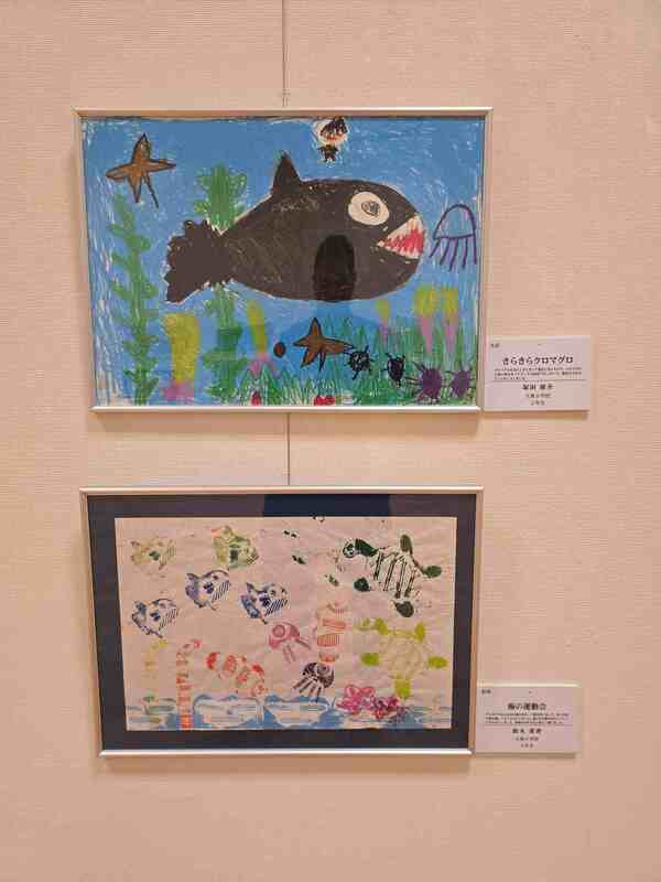 題名『きらきらクロマグロ』「・・・クロマグロの体の部分をスクラッチの技法で引っかいて、黄色を入れたところを工夫しました。」