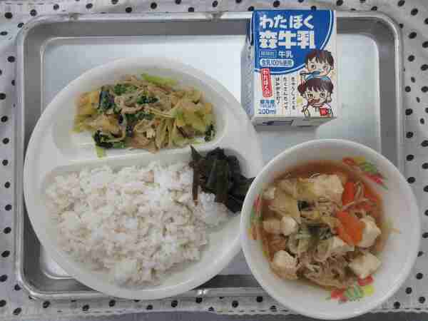 今日は、サラダで使うことの多い茎わかめで佃煮を作りました。黒糖としょうゆでじっくりと煮ました。黒糖のコクのある甘みが、麦ご飯によく合います。麦ご飯のところに、佃煮も一緒に配膳してください。