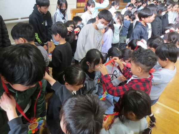 そして、みんなでつくったメダルのプレゼント。1年生が6年生の首にかけてあげました。