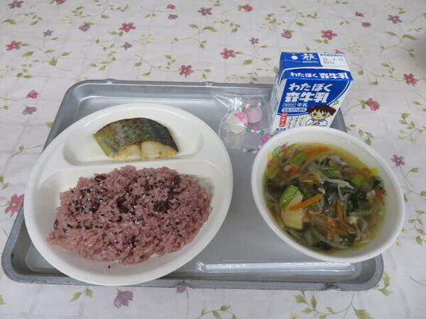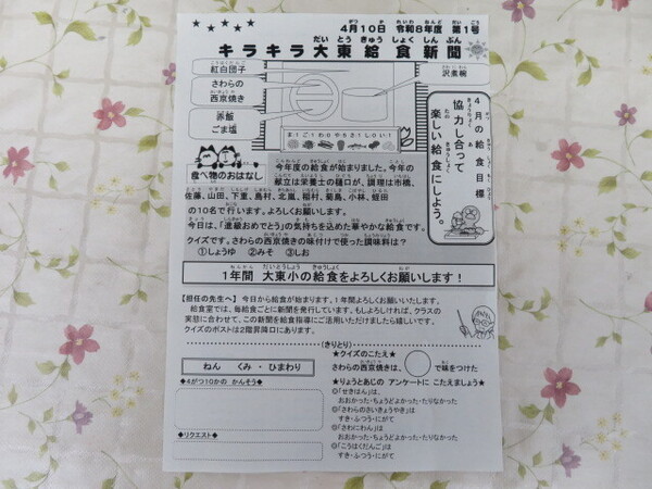 2~6年生は、今日から給食が始まりました。1年の始まりの給食メニューは、赤飯、ごま塩、沢煮椀、さわらの西京焼き、紅白団子。献立を考えてくれた栄養士さん、調理をしてくれた東洋食品10名の調理員さん、どうぞよろしくお願いいたします。赤飯は、ふっくらつやつやでとても美味。さわらの西京焼きは骨もきれいに処理され、食べやすく、味噌の味付けもとてもよし。沢煮椀は、沢山の野菜が細かく刻まれたっぷり入っています。紅白団子は、小さいながらもちゃんとあんこが入っていてうれしいデザートでした。「キラキラ大東給食新聞」も作成されており、配膳の仕方、給食クイズ、感想・リクエスト欄も加えられていて、おいしい給食をより一層楽しませてくれる内容です。栄養士さん、調理師さんの愛情をたっぷり感じる給食、毎日、感謝して食べたいものです。