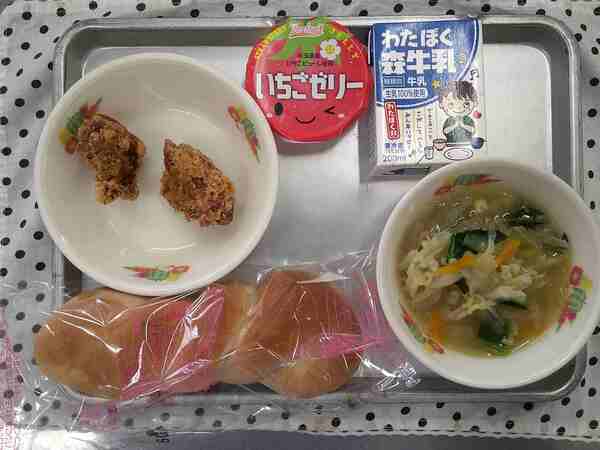 今日から1年生の給食が始まります。初日は、ちぎって食べやすいツイストパンと大東小で人気の鶏肉のから揚げ、ABCスープです。大東小の給食を気に入ってくれると嬉しいです。