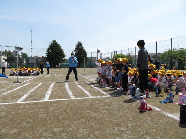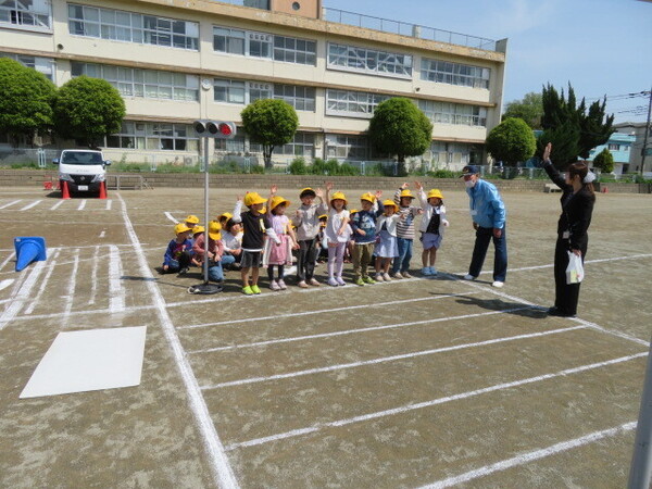 市民生活安全課の協力のもと、1年生の交通安全教室が行われました。校庭には、先生方が準備をしてくれた道路に見立てたラインが引かれ、そこに信号機を設置。立派な交差点の完成です。指導者の皆さんの話をよく聞き、道路の歩き方、横断歩道の渡り方など、実際に体験しながら学びました。登下校だけでなく、普段の生活の中でも、今日の学びを生かして、安全に道路を利用できるといいですね。