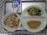 今日の給食は、熊本県の郷土料理です。びりん飯は、食べ物が少なかった時代に、肉の代わりに豆腐を使って混ぜご飯を作っていました。ご飯に入れる食材は、各家庭にあるものを利用していました。