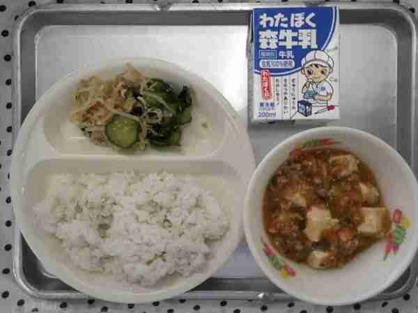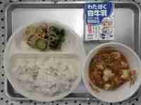 今日の給食は、中華料理の麻婆豆腐とナムルです。麻婆豆腐には、中華料理でよく使われている「トウバンジャン」という辛い調味料が入っています。今日は辛くなりすぎないうに、トウバンジャンを少なめに作りました。